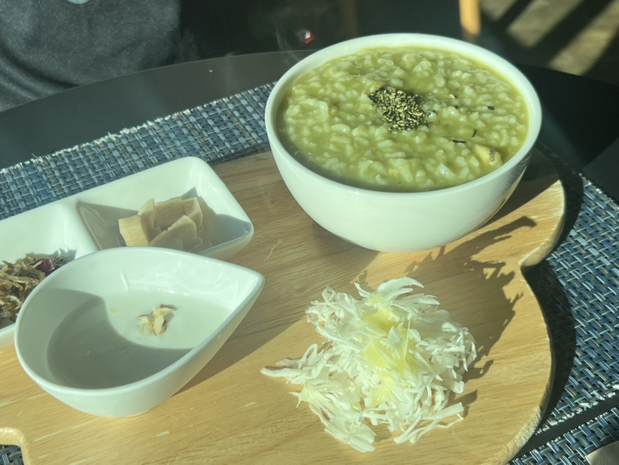 그 전날 사장님이 문자로 조식 식사 여부를 알려주시는데, 선택지는 전복죽과 빵&요거트 이렇게 두가지야